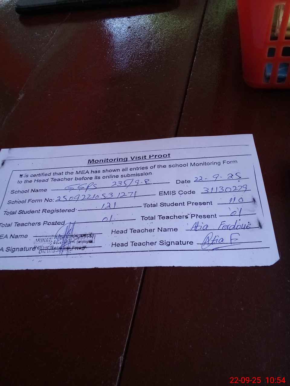 | Attendance Register | Head Teacher | MEA with School | Visit Proof |