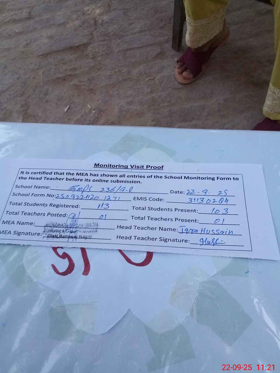 | Attendance Register | Head Teacher | MEA with School | Visit Proof |