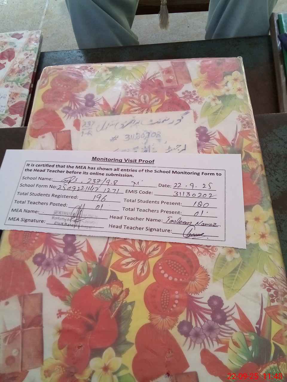 | Attendance Register | Head Teacher | MEA with School | Visit Proof |