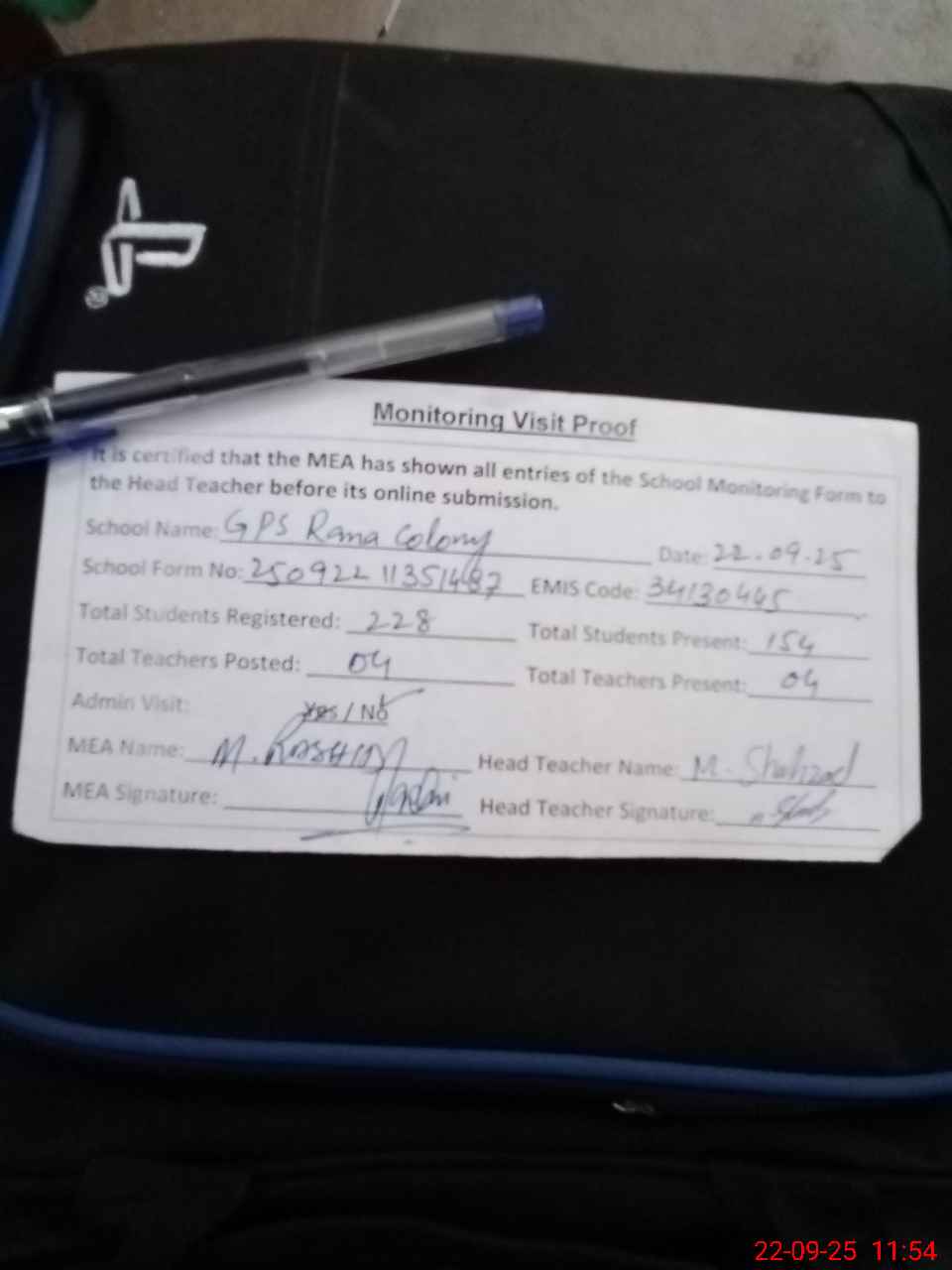 | Attendance Register | Head Teacher | MEA with School | Visit Proof |