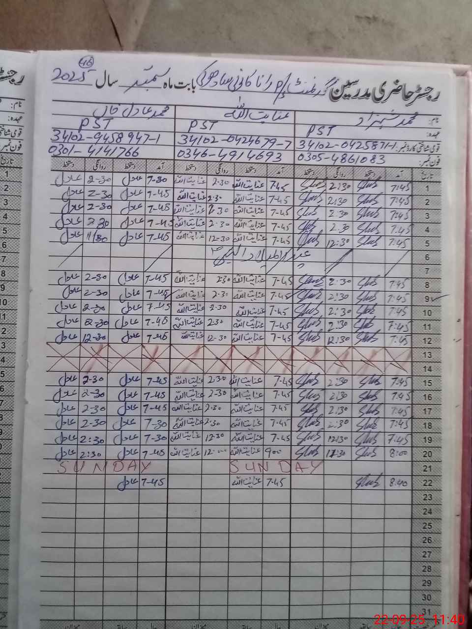 | CNIC | Full Name | Designation | R/C | Absence during last cal. month |