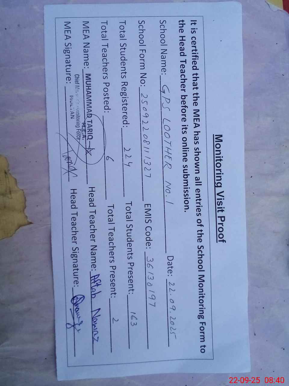 | EMIS Code: 36130197 | Name of School: GPS LOOTHER NO. 1 | |||