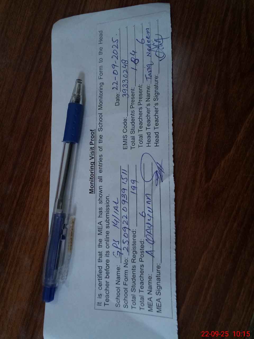 | Attendance Register | Head Teacher | MEA with School | Visit Proof |