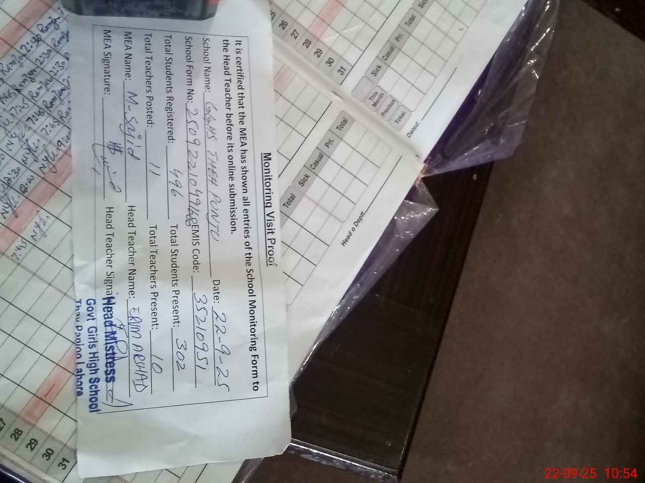 | Attendance Register | Head Teacher | MEA with School | Visit Proof |
