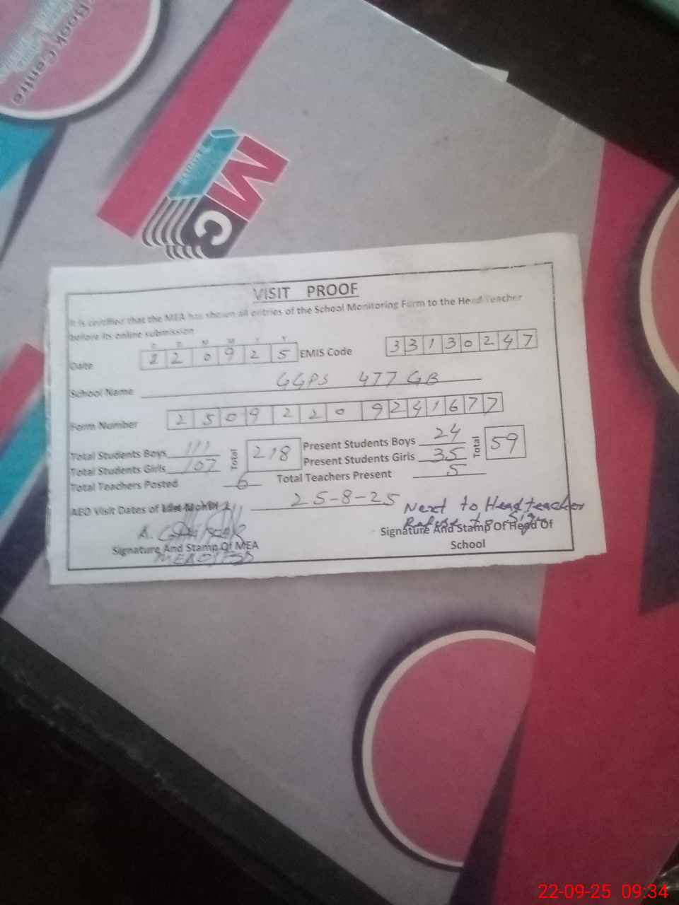 | Remarks (Use Separate Page if Required): AS I ENTERED IN GGPS 477 GB EAST HEADTEACHER MUHAMMAD AFZAL DID NOT PRESENT IN SCHOOL AND ALSO SCHOOL ORDER BOOK IS NOT AVAILABLE TEACHERS FEMALE PRESENT IN SCHOOL INFORMED THAT HEADTEACHER IS IN 2ND PORTION OF THE SCHOOL I VISIT THERE BUT TEACHER AFZAL NOT PRESENT IN SCHOOL AND AFTER SOME TIME HE ARRIVED IN SCHOOL ALSO TAKE A PICTURE FROM OTHER TEACHER DRINKING WATER IS NOT AVAILABLE CLEANING OF LAWN IS POOR | |||||