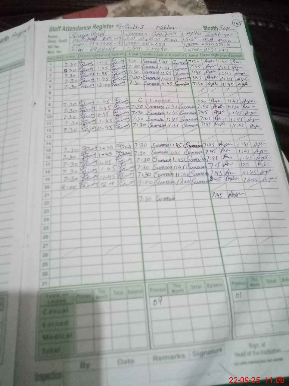 | CNIC | Full Name | Designation | R/C | Absence during last cal. month |