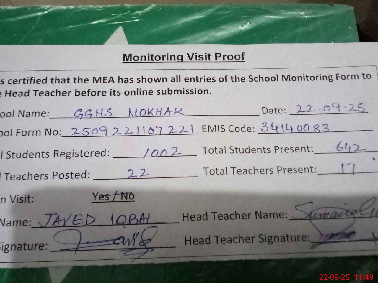 | Attendance Register | Head Teacher | MEA with School | Visit Proof |