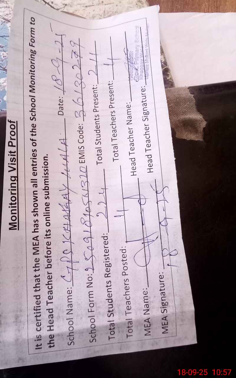 | Attendance Register | Head Teacher | MEA with School | Visit Proof |