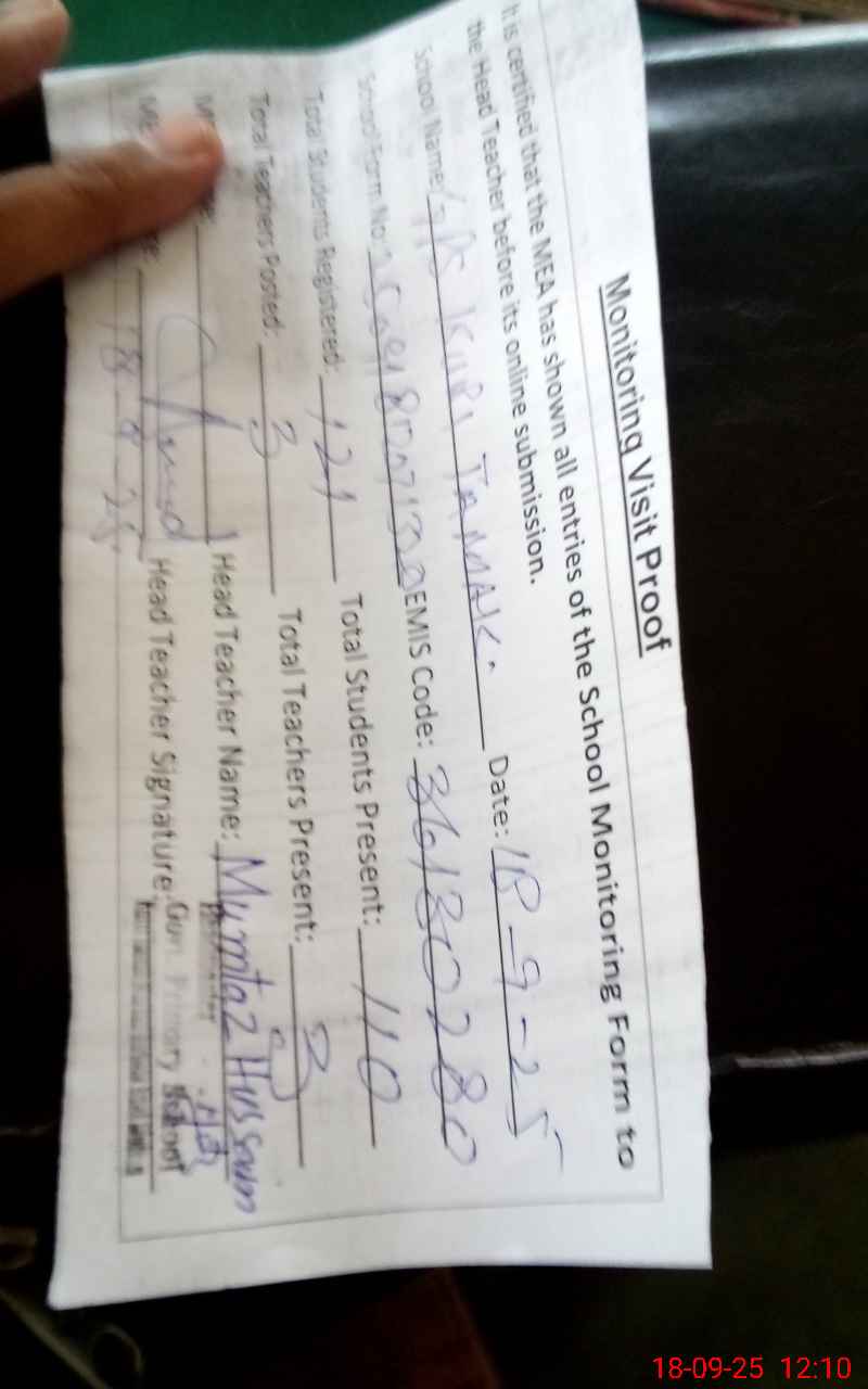 | Attendance Register | Head Teacher | MEA with School | Visit Proof |