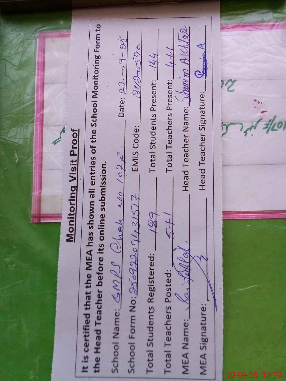 | Attendance Register | Head Teacher | MEA with School | Visit Proof |