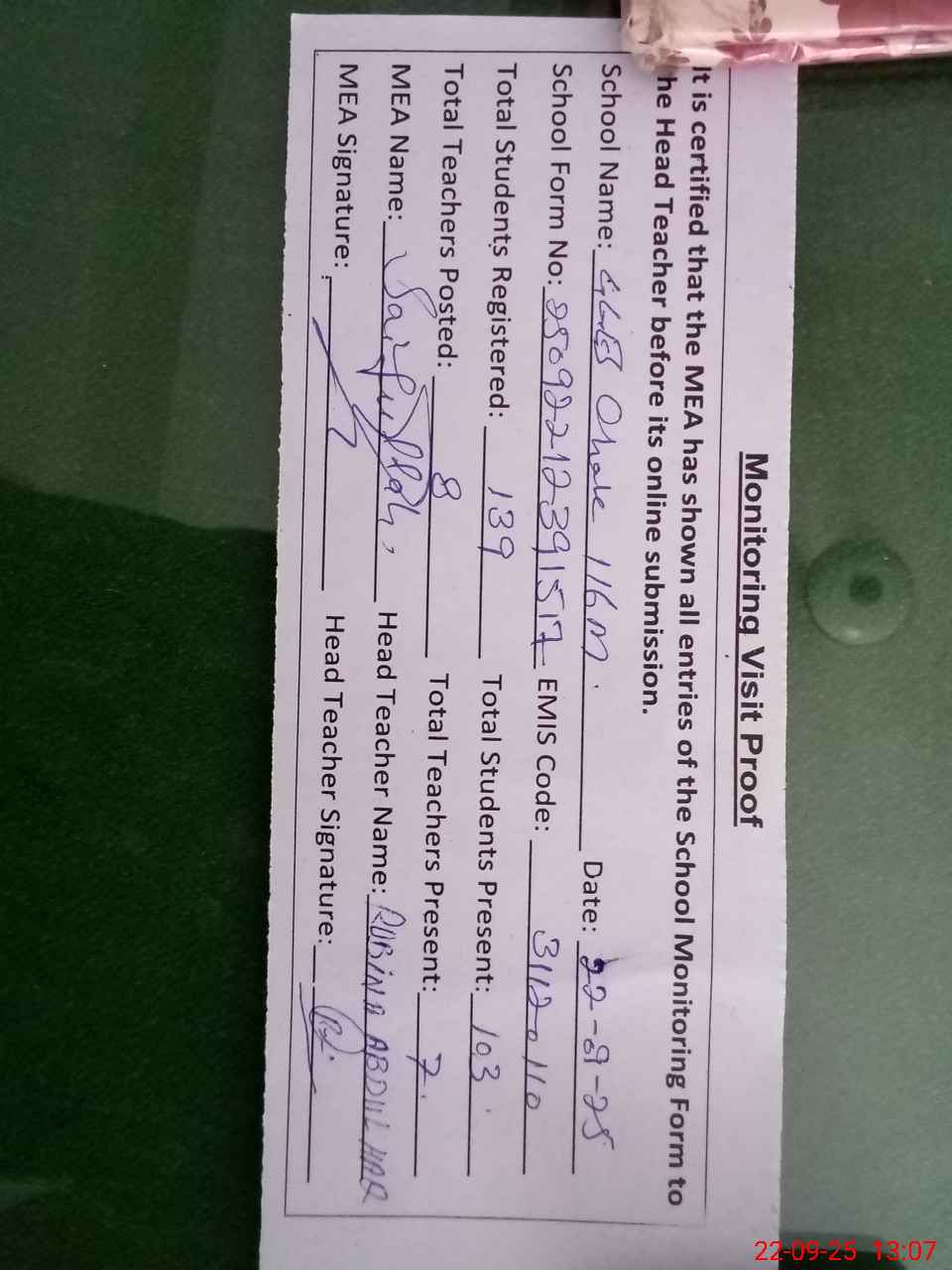 | Attendance Register | Head Teacher | MEA with School | Visit Proof |