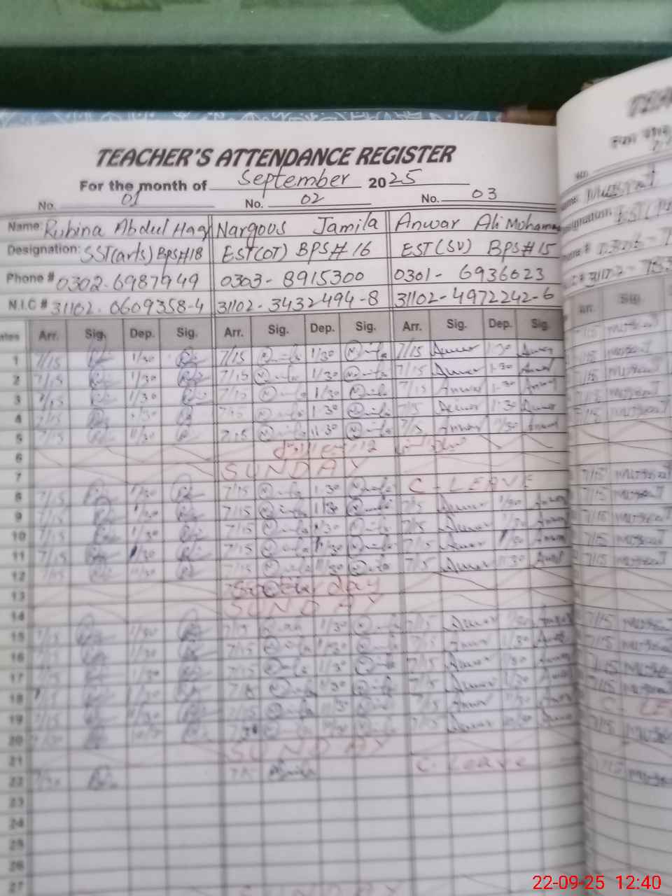| CNIC | Full Name | Designation | R/C | Absence during last cal. month |