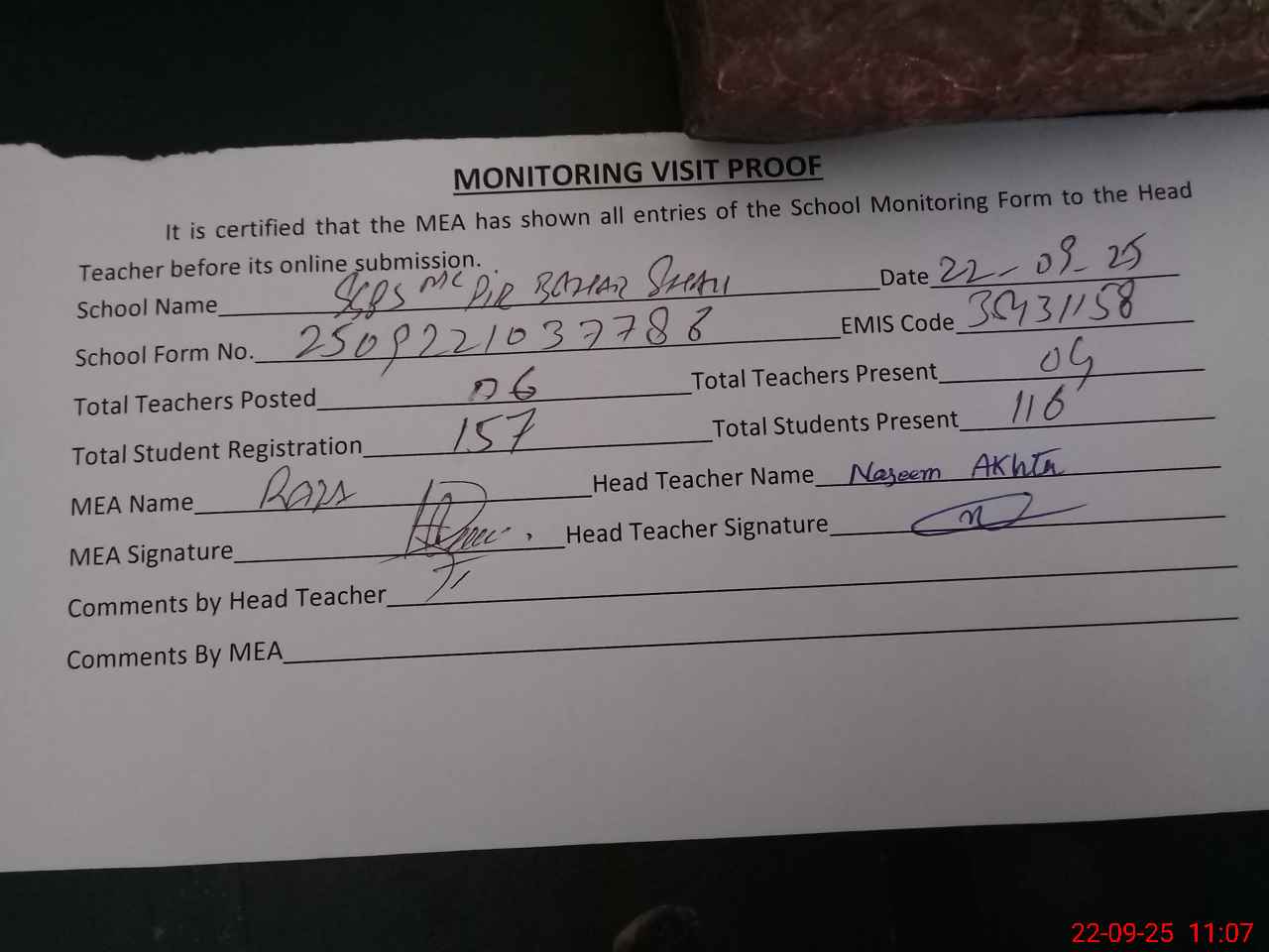 | Attendance Register | Head Teacher | MEA with School | Visit Proof |