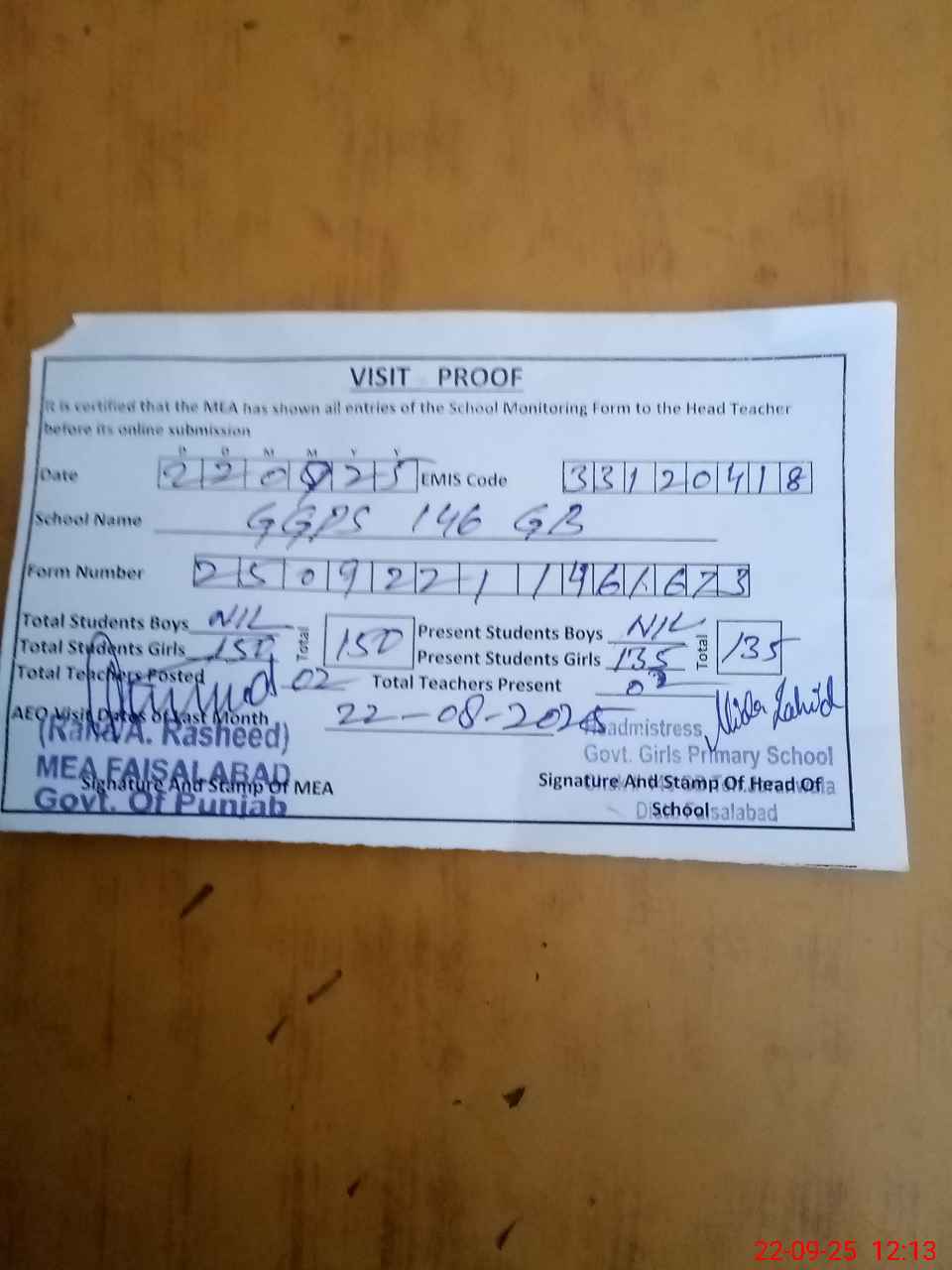 | Attendance Register | Head Teacher | MEA with School | Visit Proof |
