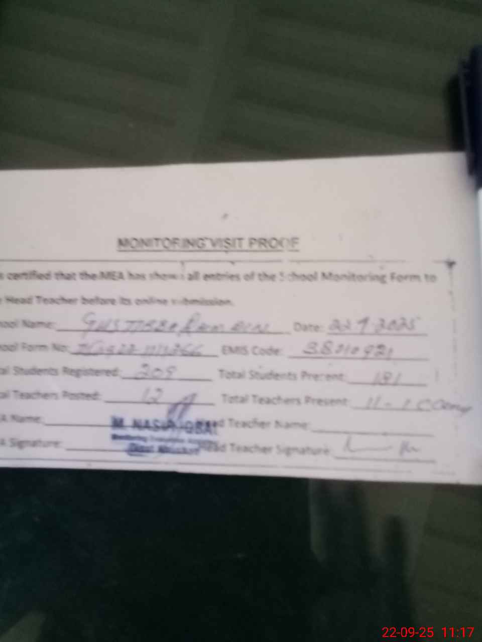 | Attendance Register | Head Teacher | MEA with School | Visit Proof |