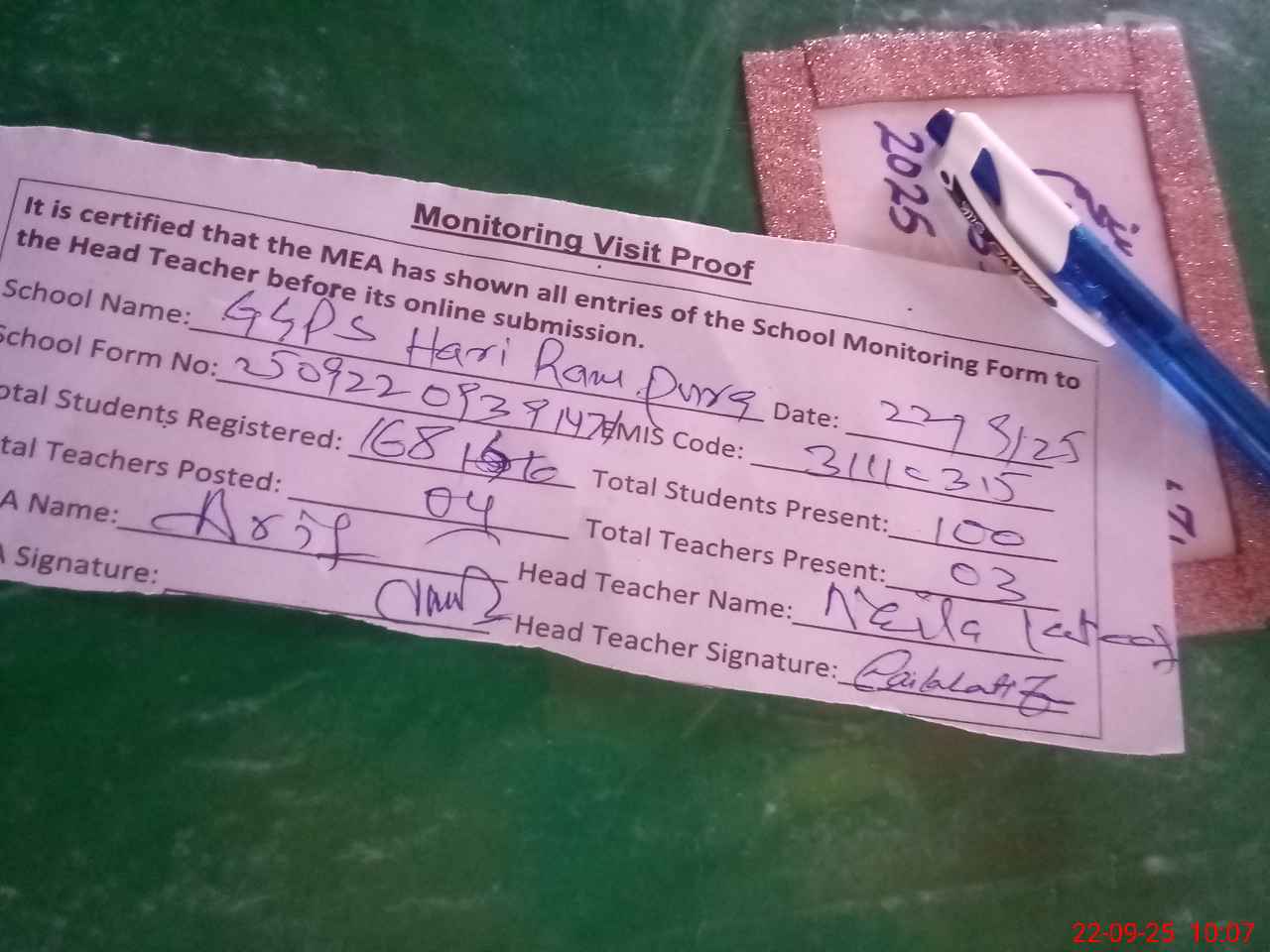 | EMIS Code: 31110315 | Name of School: GGPS HARI RAM PURA | |||