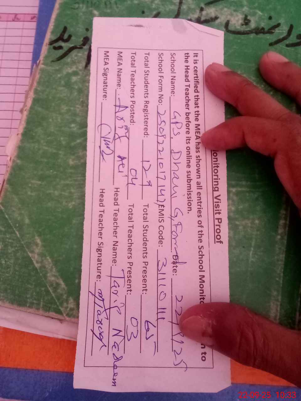 | EMIS Code: 31110111 | Name of School: GPS DHANI GHULAM FAREED | |||