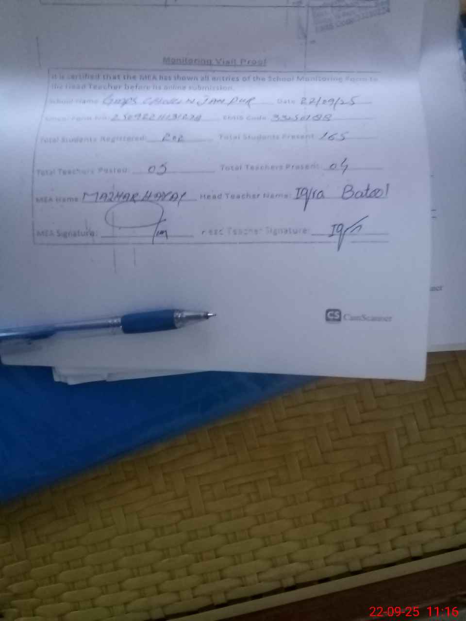 | Attendance Register | Head Teacher | MEA with School | Visit Proof |