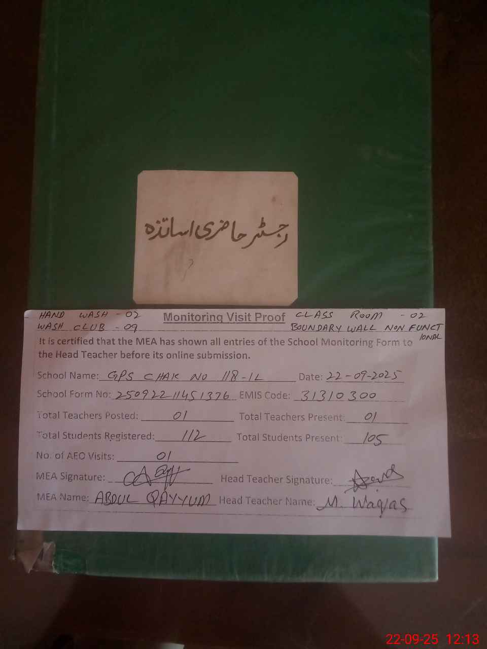 | Attendance Register | Head Teacher | MEA with School | Visit Proof |