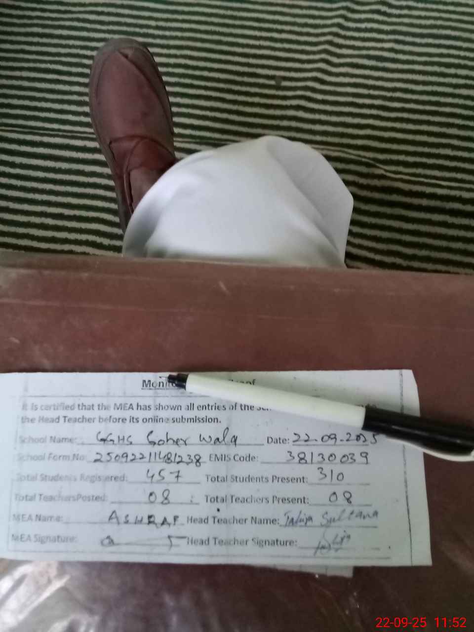 | Monitoring Date: 22-09-2025 | Start Time: 22-09-2025 11:08 AM | End Time: 22-09-2025 11:53 AM | Name of MEA: Mu**** As**** | |