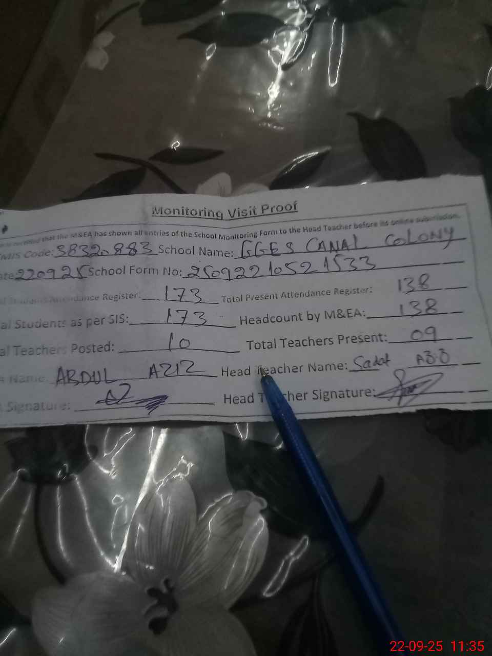 | Attendance Register | Head Teacher | MEA with School | Visit Proof |