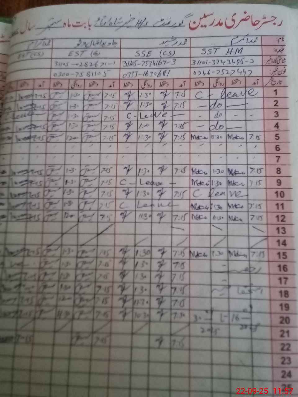 | CNIC | Full Name | Designation | R/C | Absence During Last Calender Month |