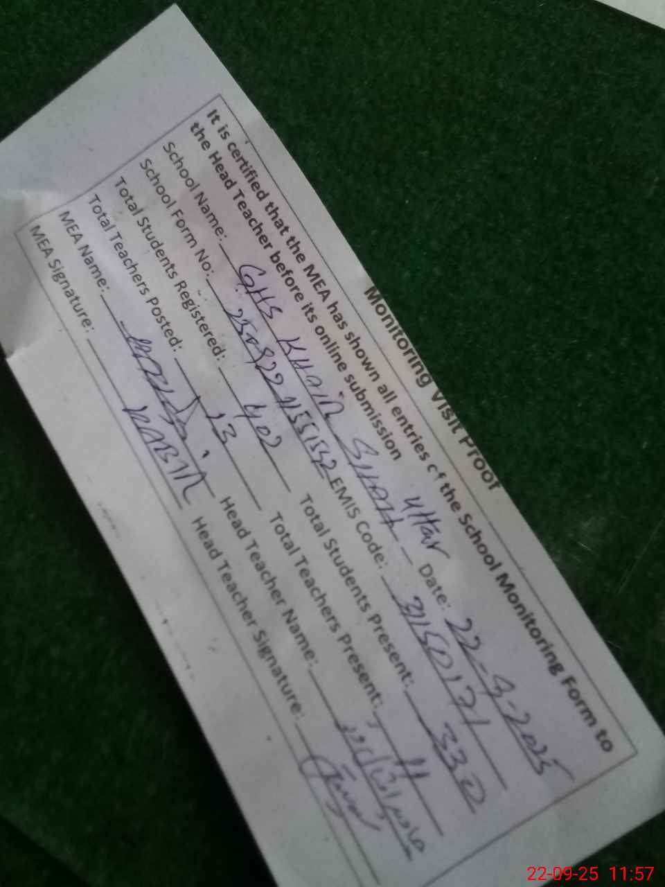 | Attendance Register | Head Teacher | MEA with School | Visit Proof |