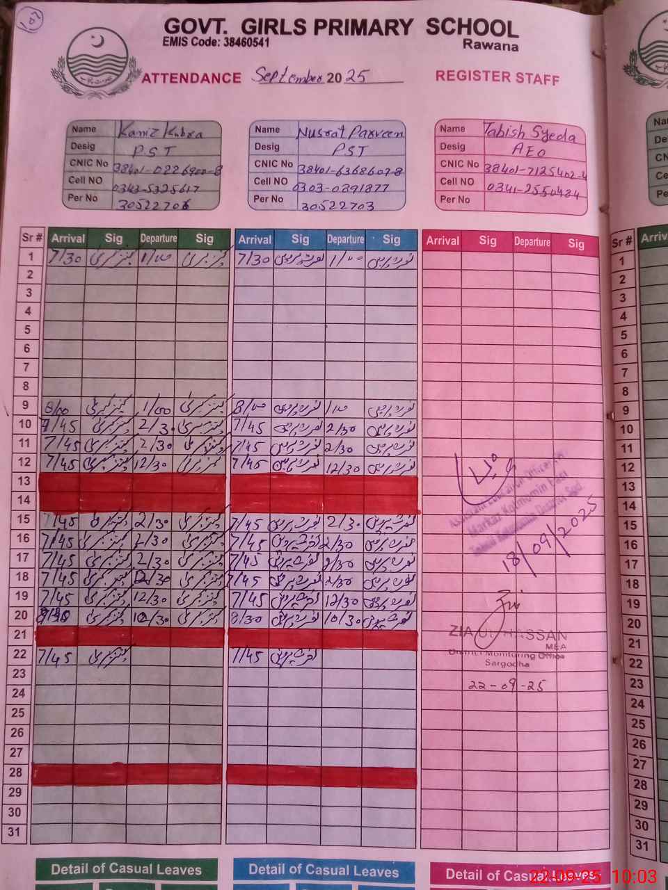 | CNIC | Full Name | Designation | R/C | Absence during last cal. month |