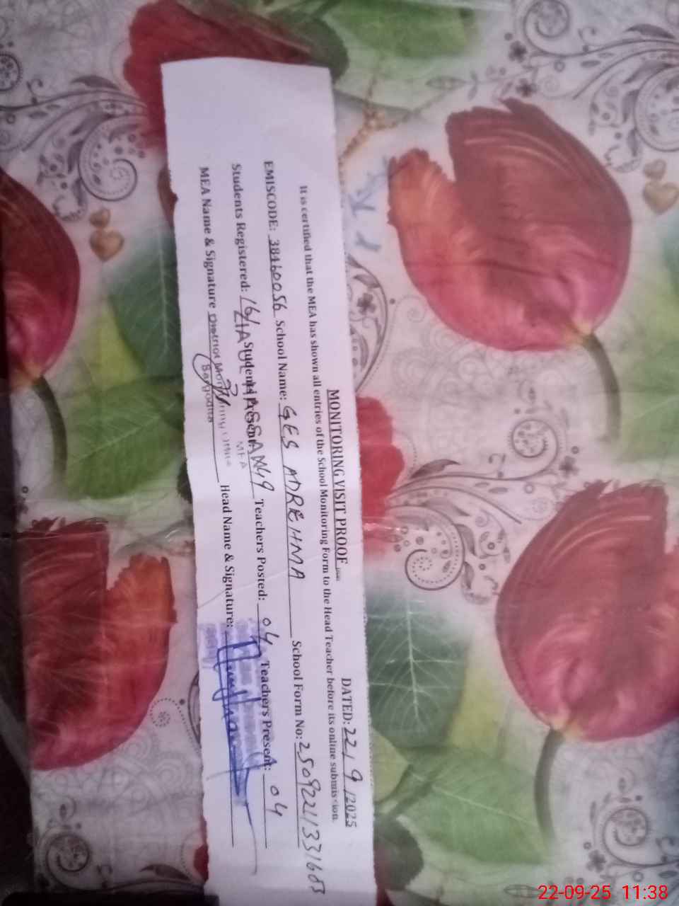 | Attendance Register | Head Teacher | MEA with School | Visit Proof |