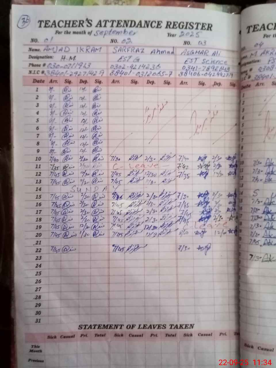 | CNIC | Full Name | Designation | R/C | Absence during last cal. month |