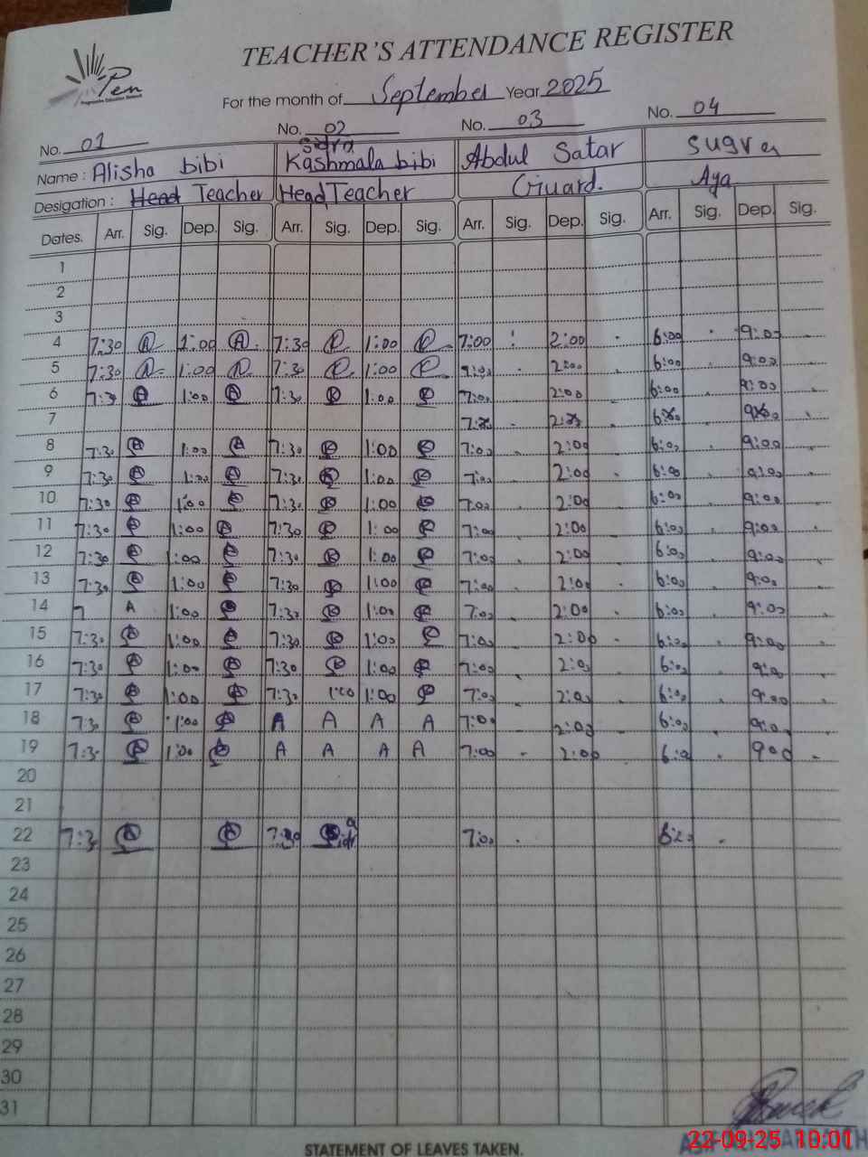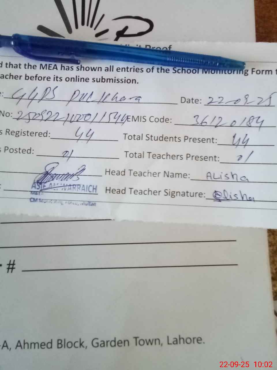 | Attendance Register | Head Teacher | MEA with School | Visit Proof |