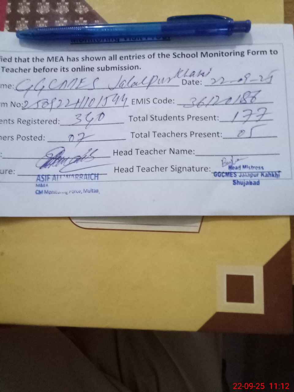 | Attendance Register | Head Teacher | MEA with School | Visit Proof |