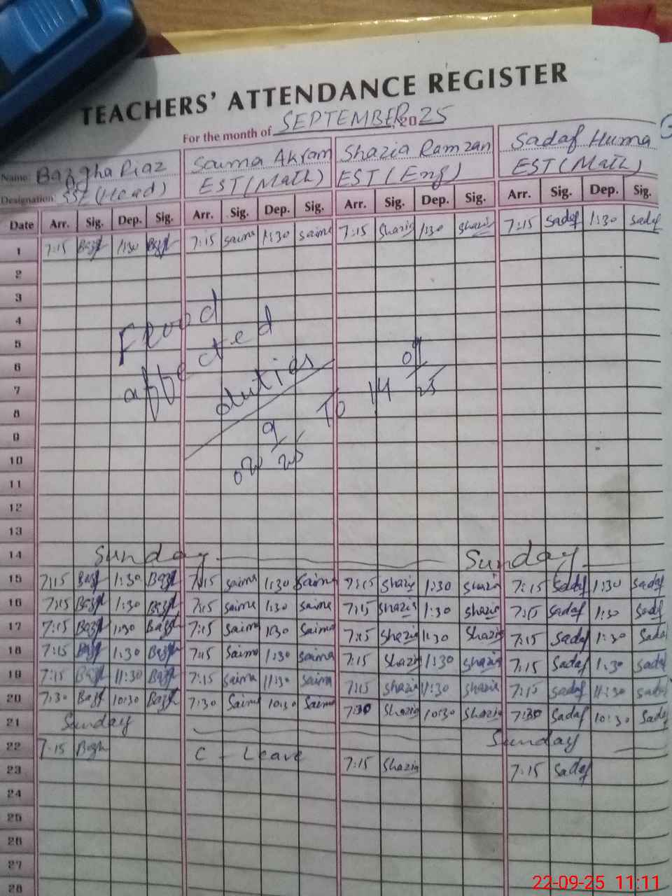 | CNIC | Full Name | Designation | R/C | Absence During Last Calender Month |