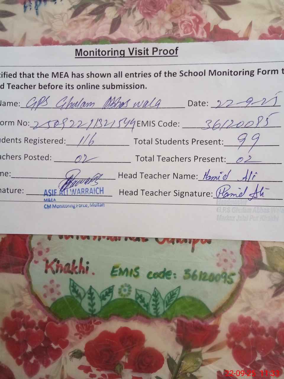 | Attendance Register | Head Teacher | MEA with School | Visit Proof |