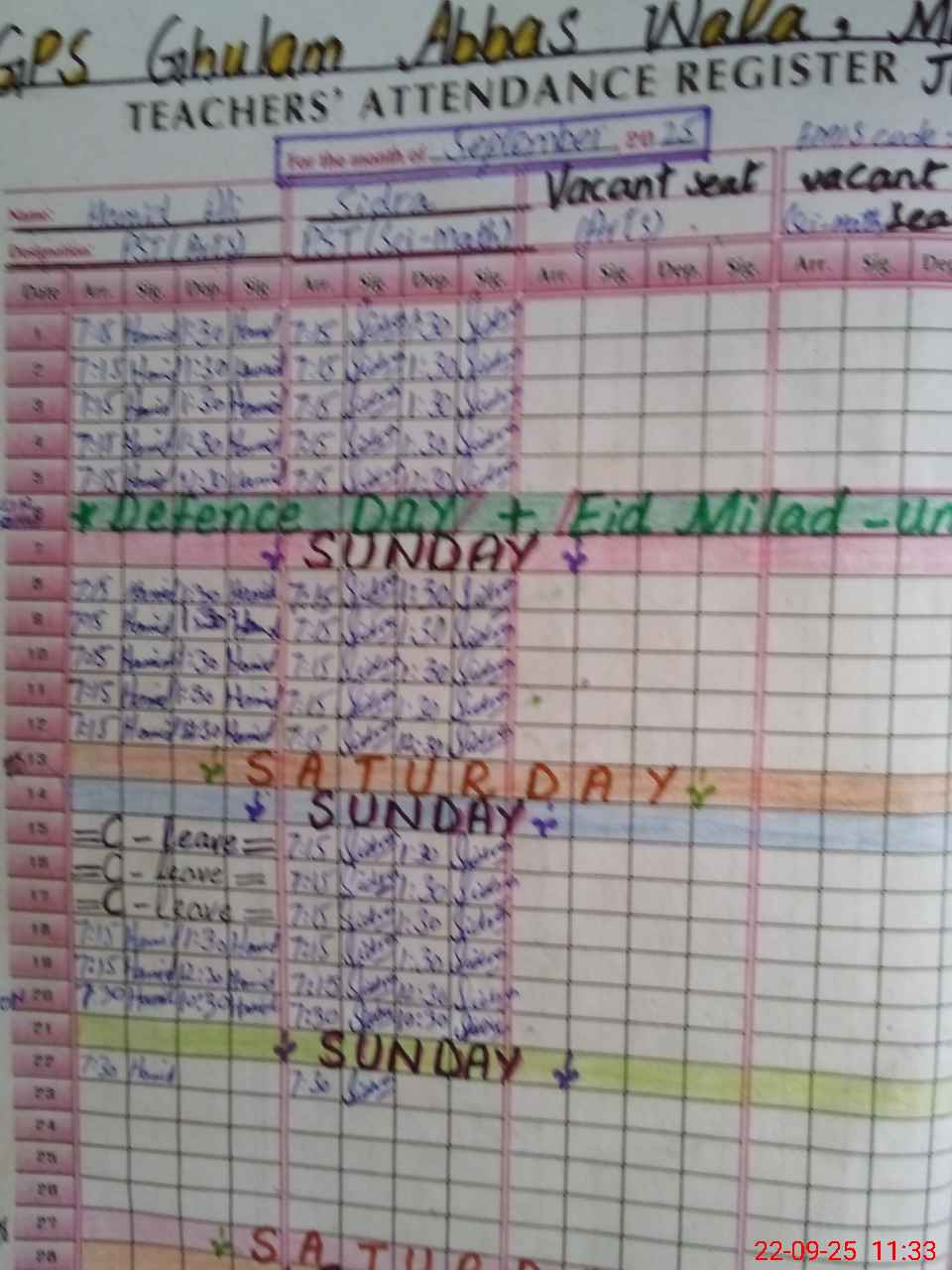 | CNIC | Full Name | Designation | R/C | Absence During Last Calender Month |