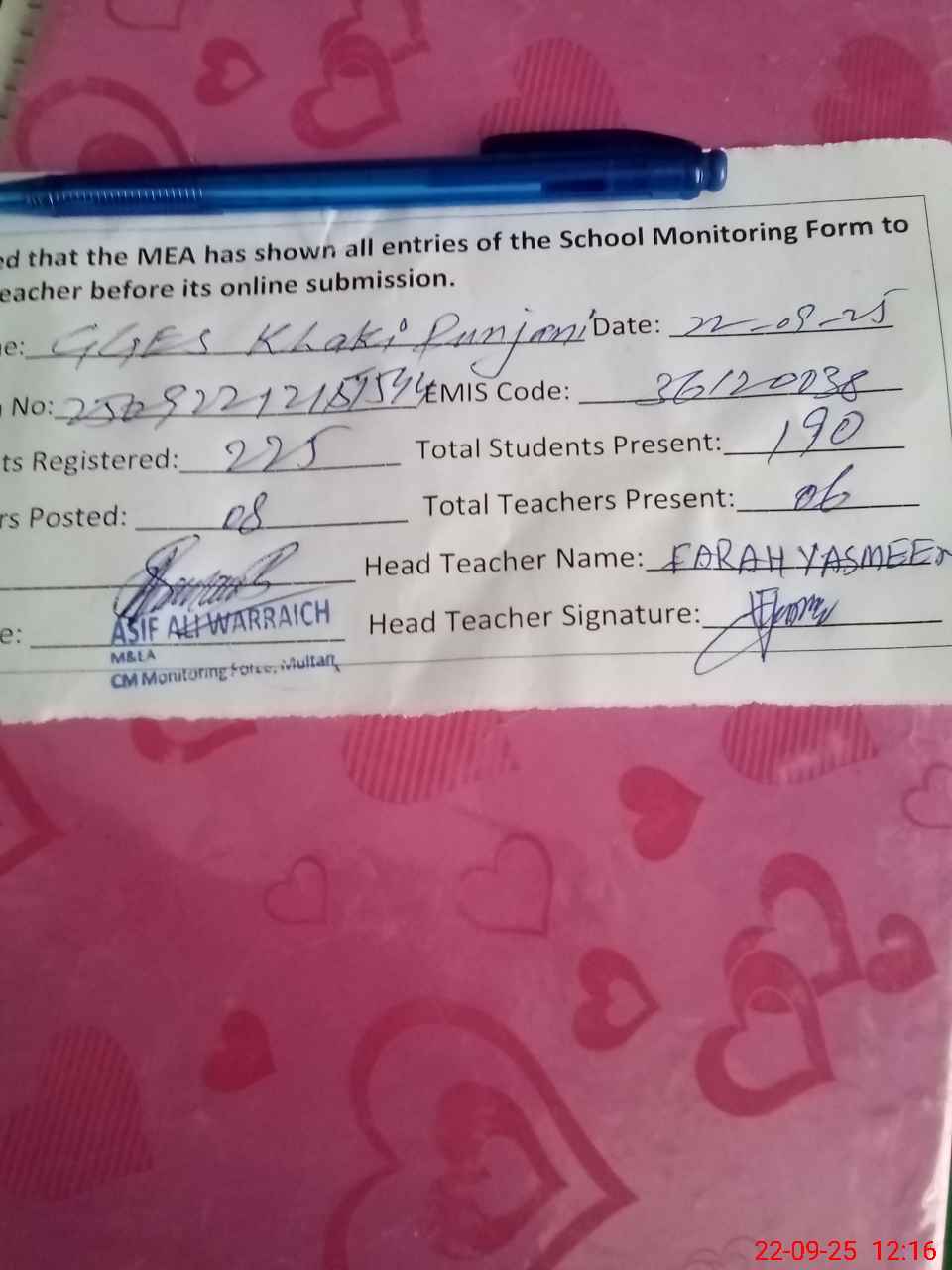 | Certified that this School was Inspected by the Undersigned MEA/DMO Today and the Information Stated Above is as Per Record. | |||||