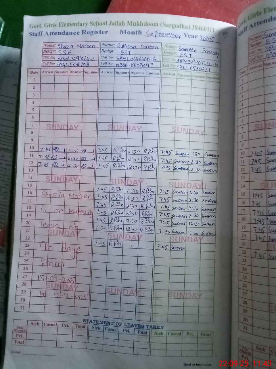 | CNIC | Full Name | Designation | R/C | Absence During Last Calender Month |