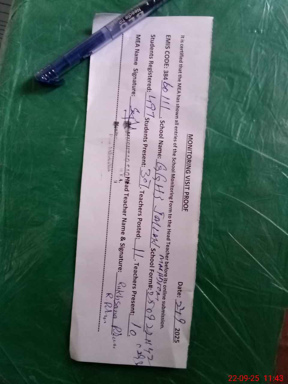 | Attendance Register | Head Teacher | MEA with School | Visit Proof |