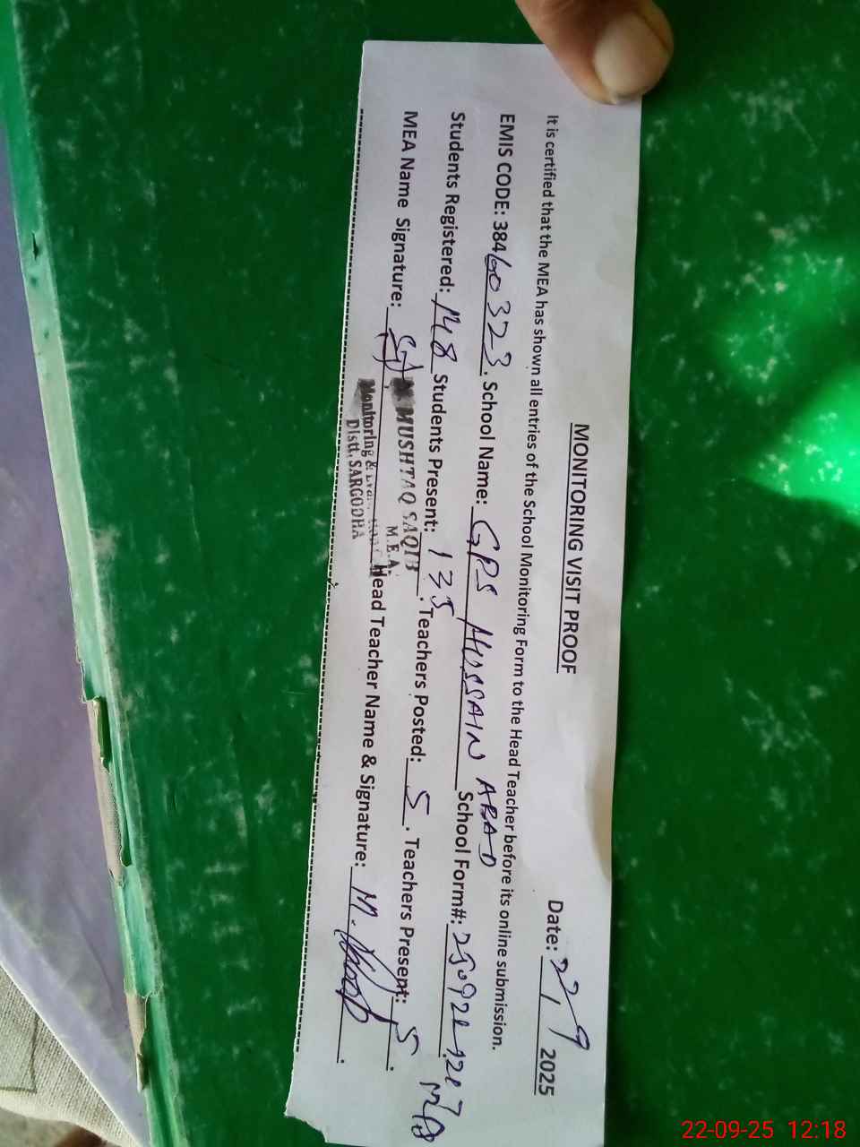 | Attendance Register | Head Teacher | MEA with School | Visit Proof |