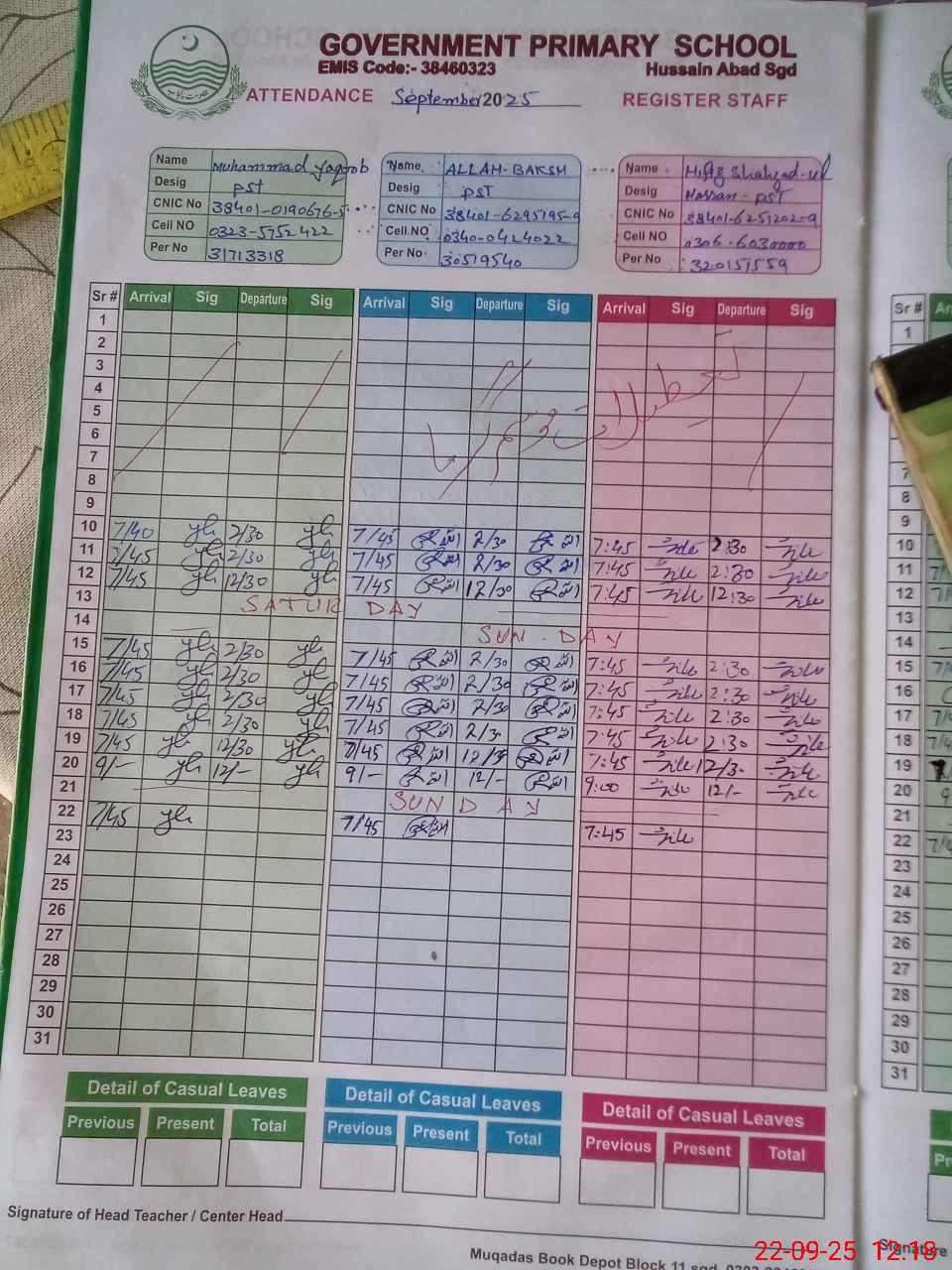 | CNIC | Full Name | Designation | R/C | Absence during last cal. month |