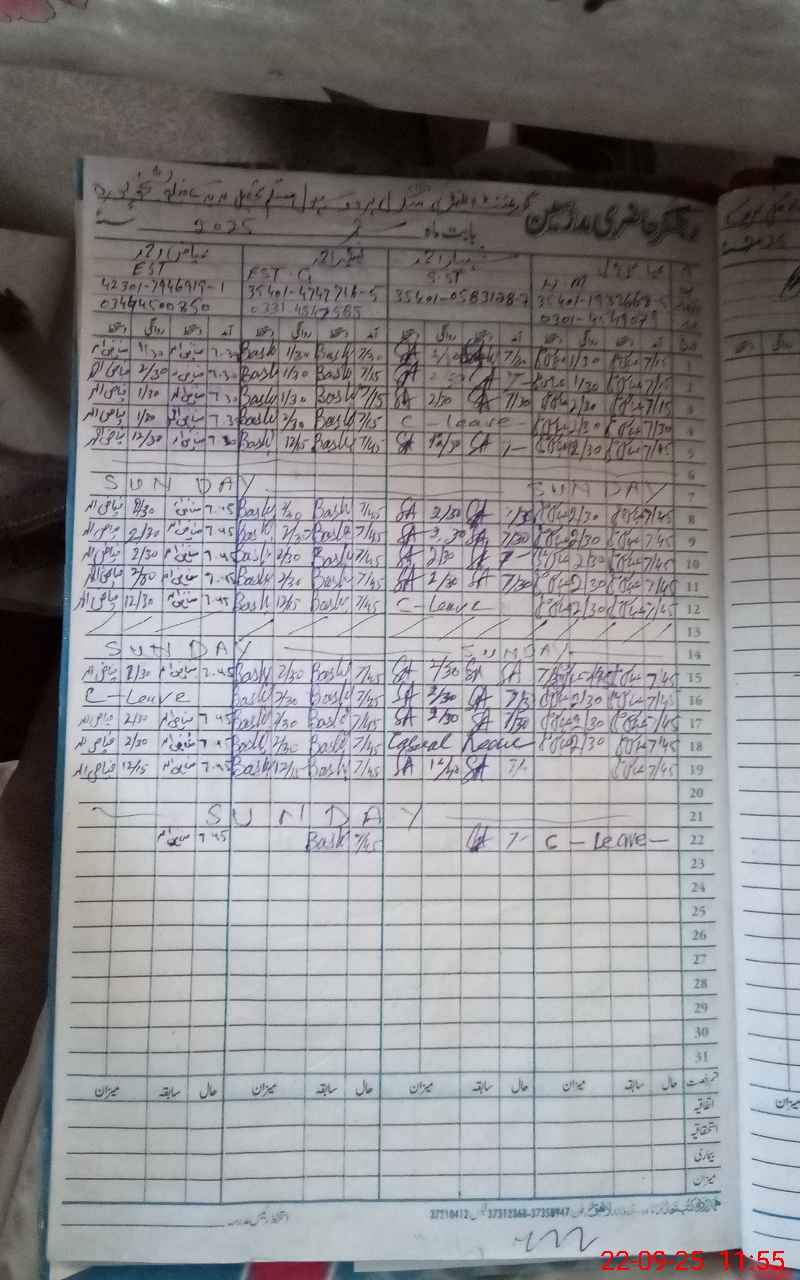 | CNIC | Full Name | Designation | R/C | Absence During Last Calender Month |