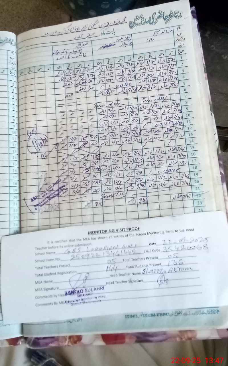 | Attendance Register | Head Teacher | MEA with School | Visit Proof |