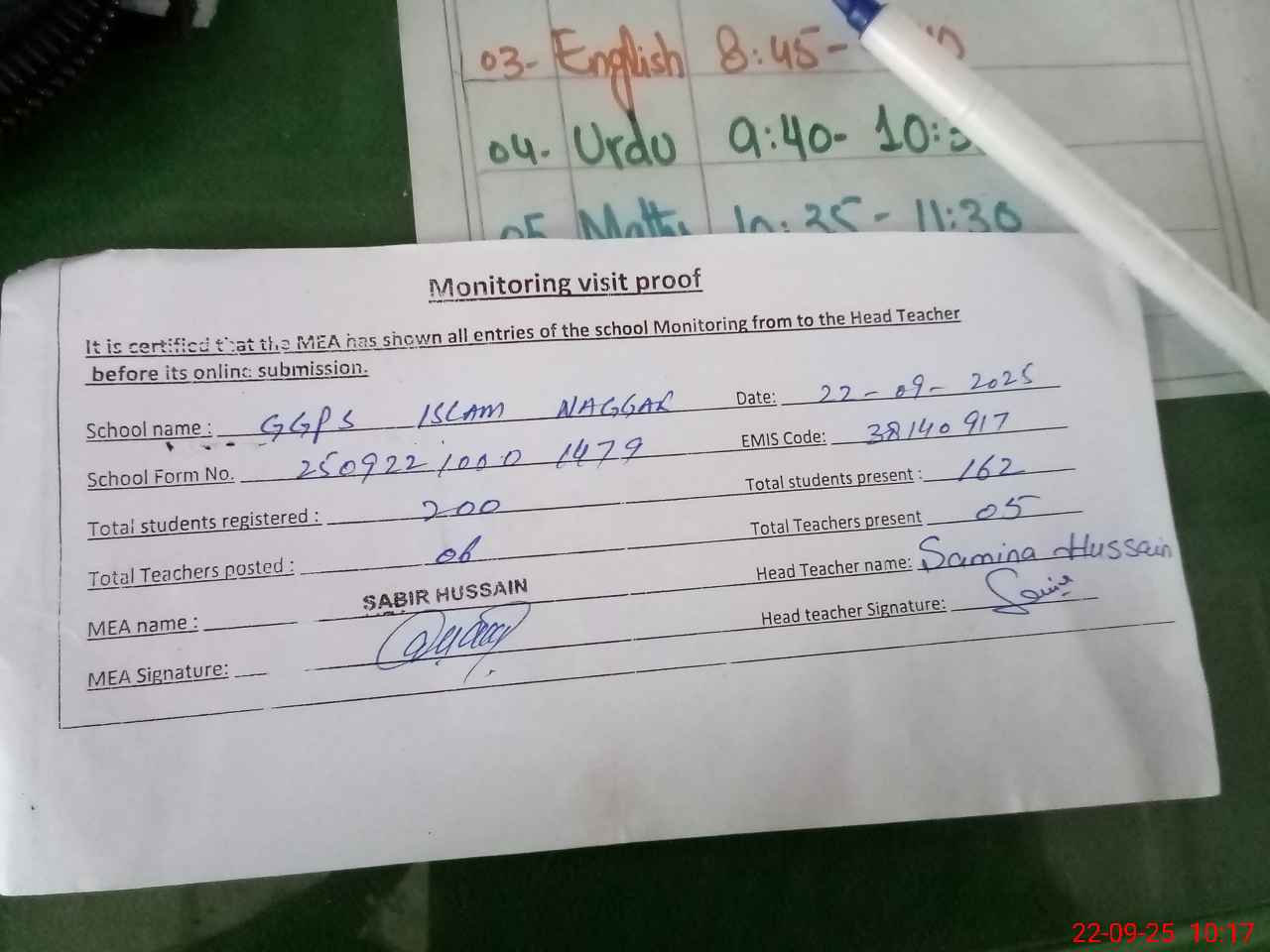 | Attendance Register | Head Teacher | MEA with School | Visit Proof |