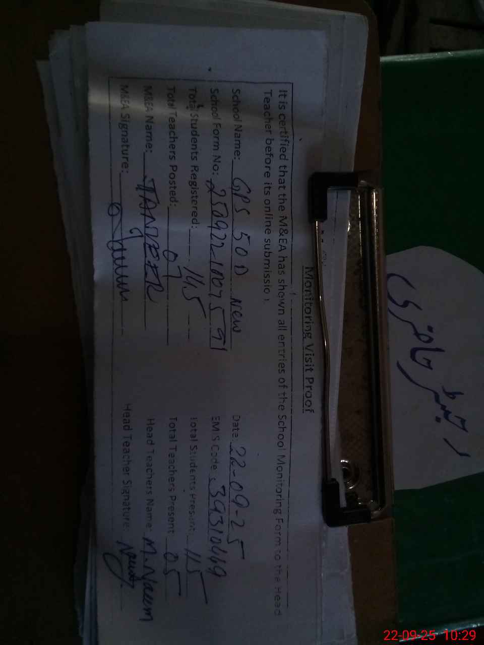 | Attendance Register | Head Teacher | MEA with School | Visit Proof |