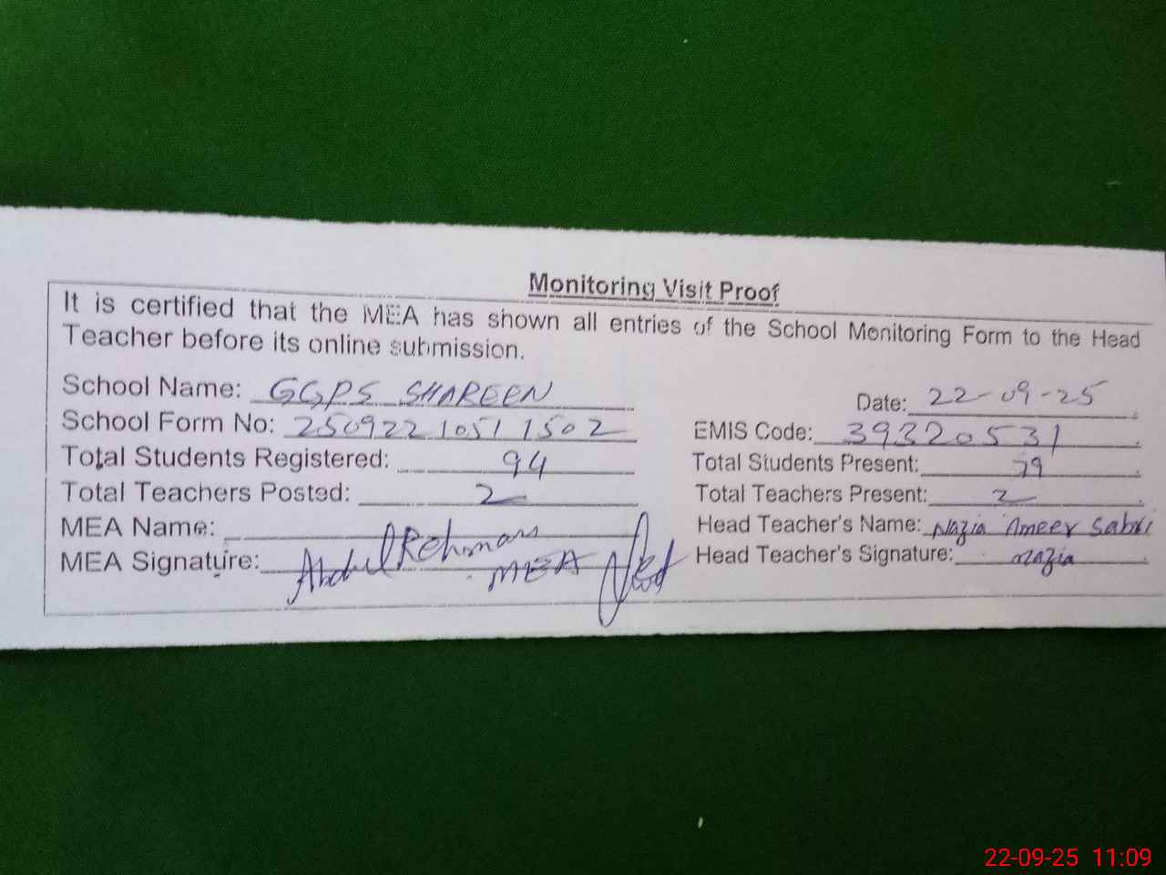 | Attendance Register | Head Teacher | MEA with School | Visit Proof |