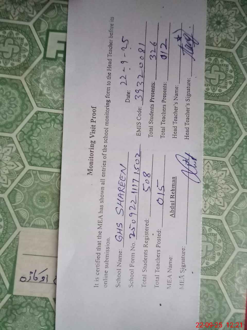 | EMIS Code: 39320081 | Name of School: GHS SHAREEN | |||