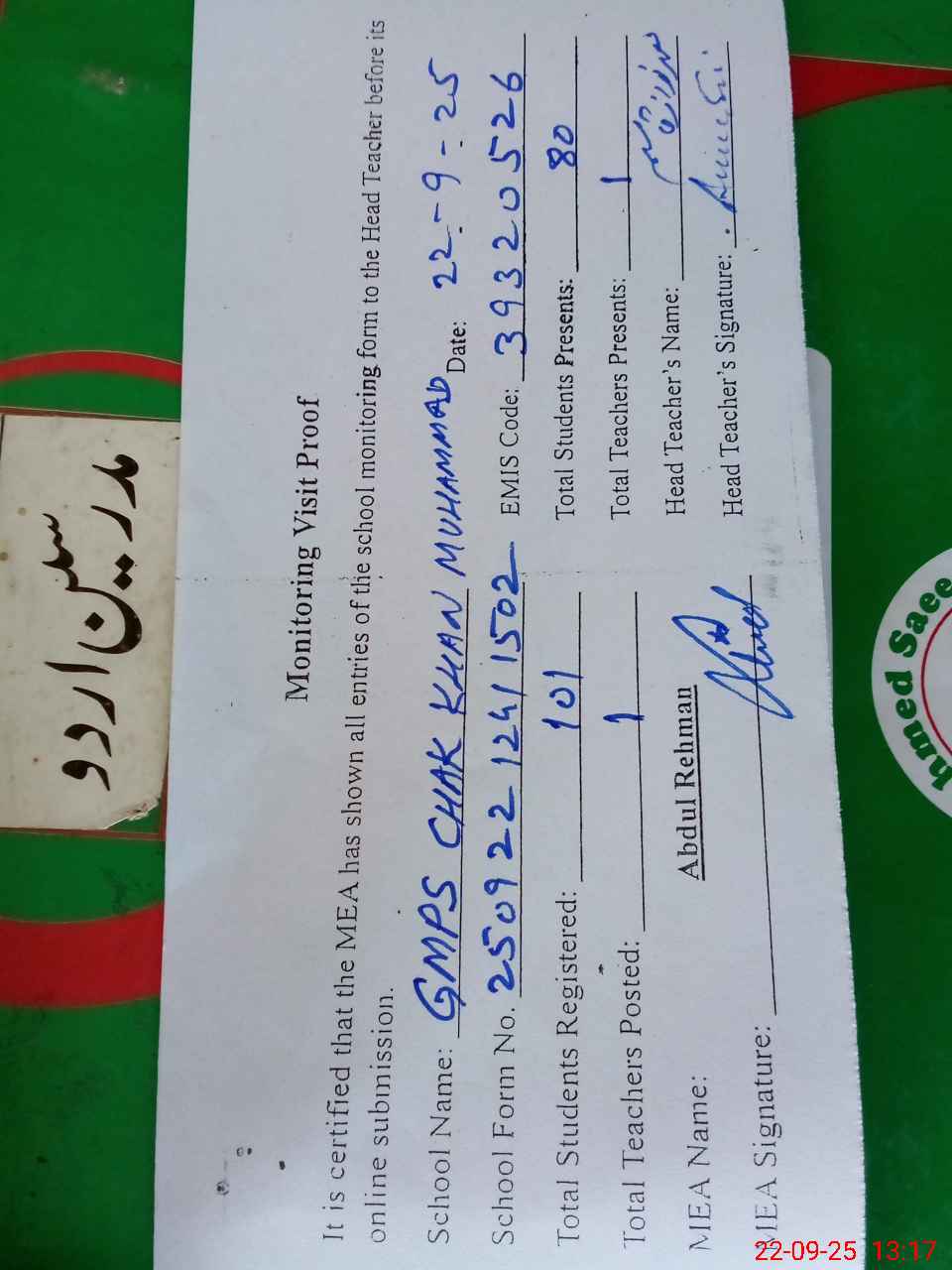| Attendance Register | Head Teacher | MEA with School | Visit Proof |