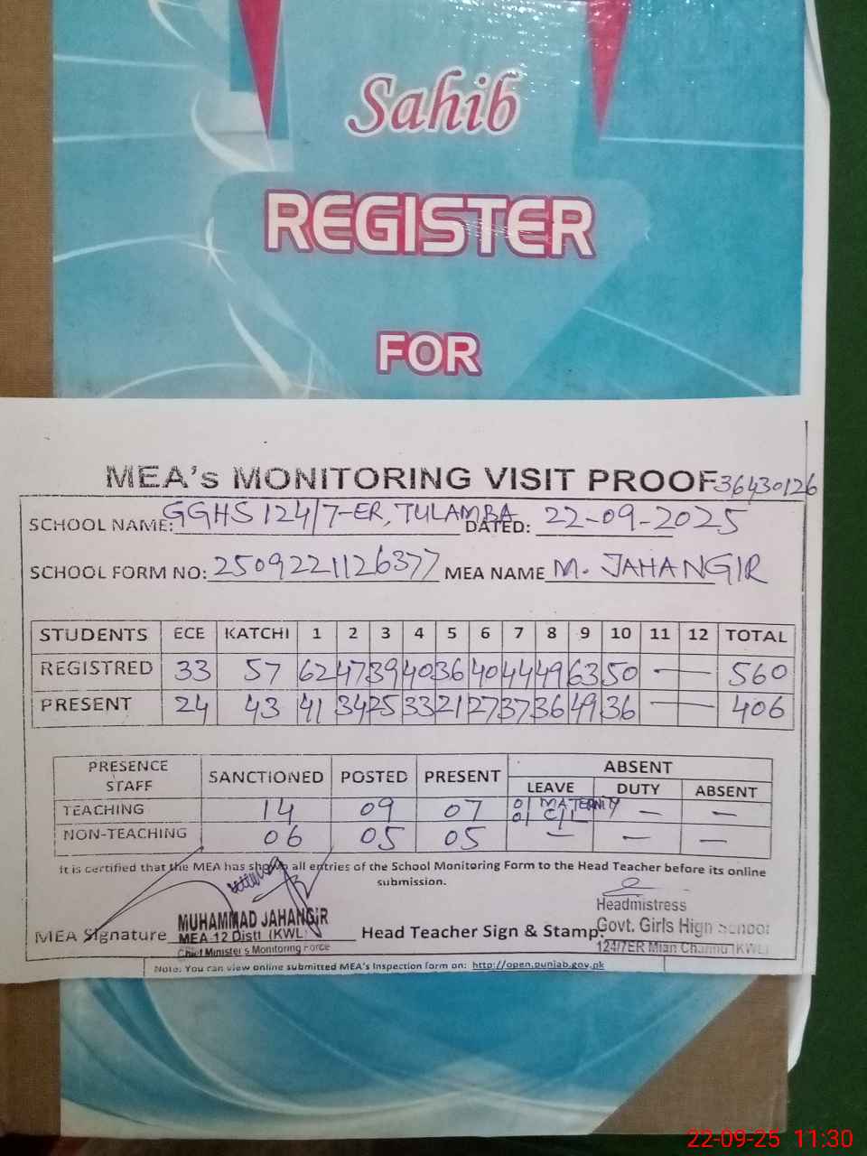 | Attendance Register | Head Teacher | MEA with School | Visit Proof |