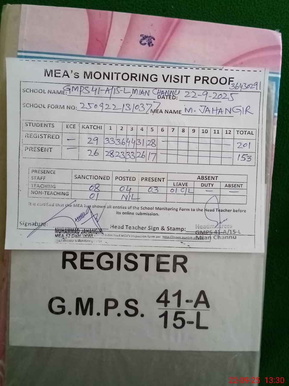| Attendance Register | Head Teacher | MEA with School | Visit Proof |