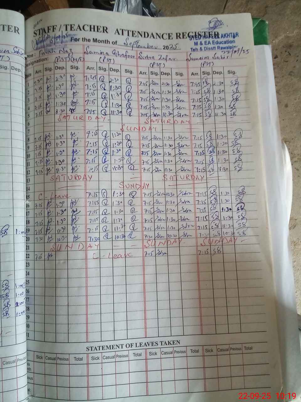 | Remarks (Use Separate Page if Required): Teacher Samina Ghafoor PST is marked as on c leave in attendance register while no online approval and no sanctioned application found in school so I marked her as un authorised absent NSB record not updated in pmiu app Students of class 5 listed in pmiu app are not updated All students have left school after promotion from class 5 | |||||